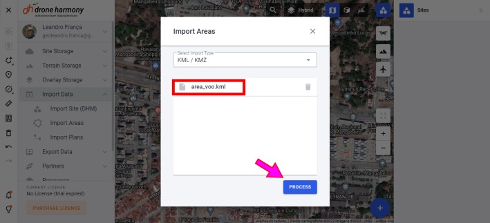 3 – Selecione o arquivo KML/KMZ da área a ser mapeada e carregue o polígono da área selecionada para o voo