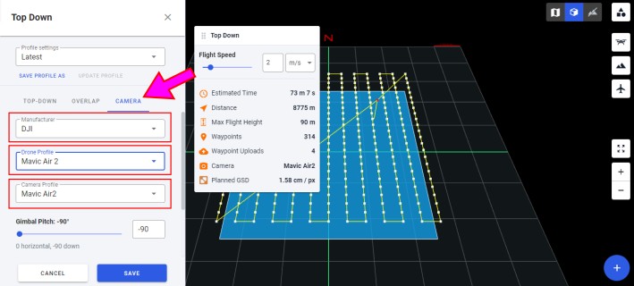 Observação: Deixar a opção “Compute optimal flight directions” habilitada para obter a direção de voo ideal.