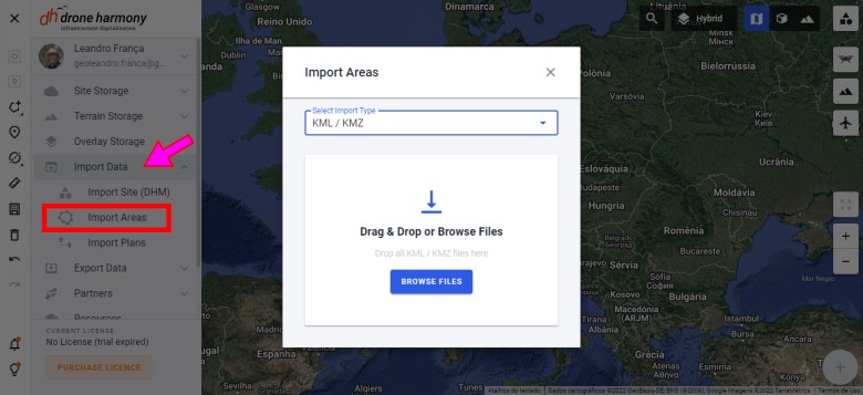 2 – Em seguida, acesse Import Data > Import Areas > KML/KMZ